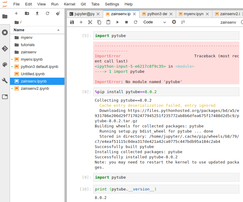 Here you can see I installed the pytube package in one environment